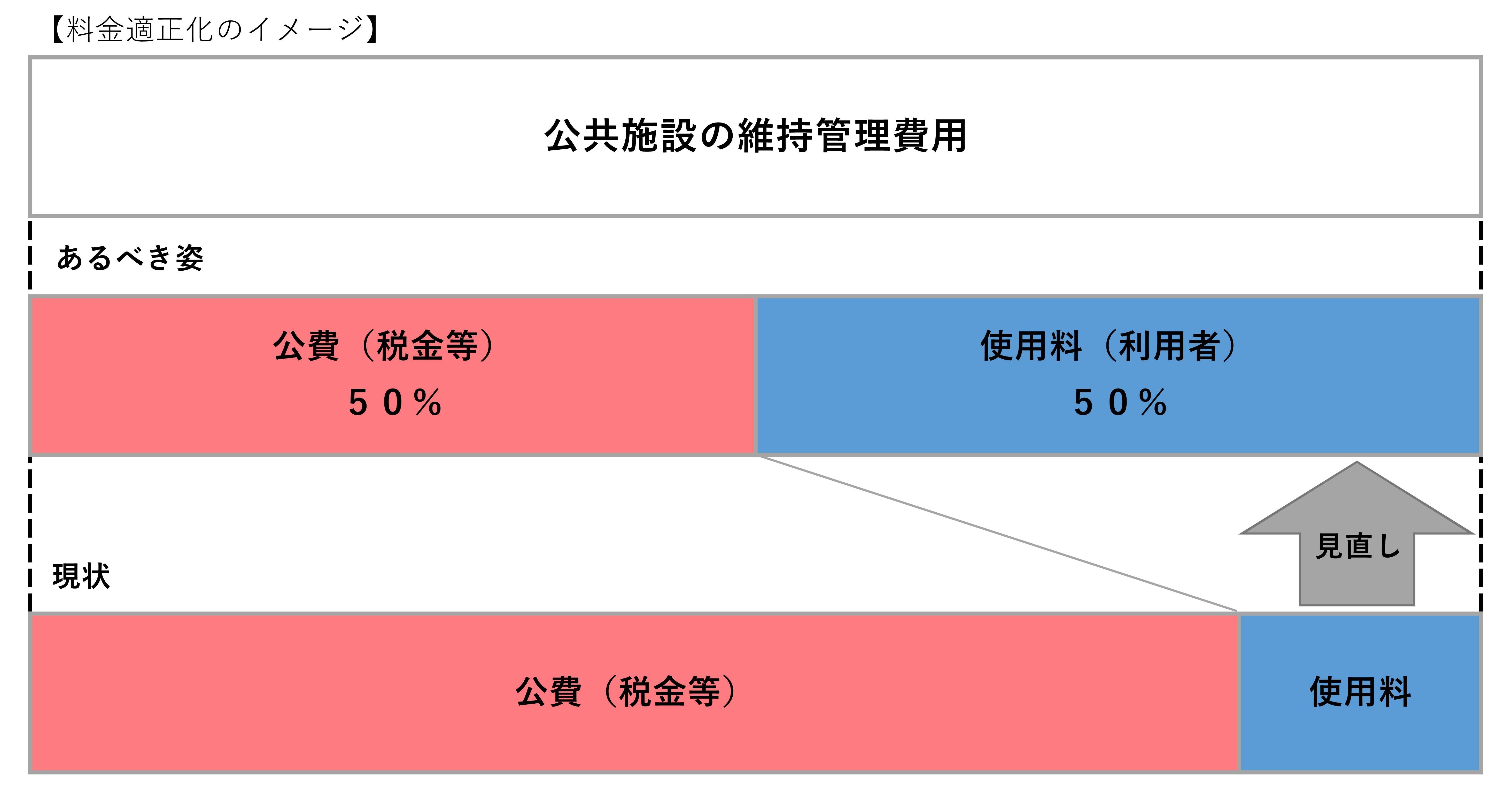 行政サービスを提供するには、施設の維持管理費や人件費などの経費がかかります。これらの経費は、行政サービスを利用する人が負担する使用料や手数料と、市民の税金で賄っています。行政サービスを利用していない人も経費の一部を負担していることから、行政サービスを利用する受益者が応分の対価を負担することで、行政サービスを利用する人と利用しない人との負担の公平性を確保する必要があります。この公平性を確保するのが受益者負担の適正化です。