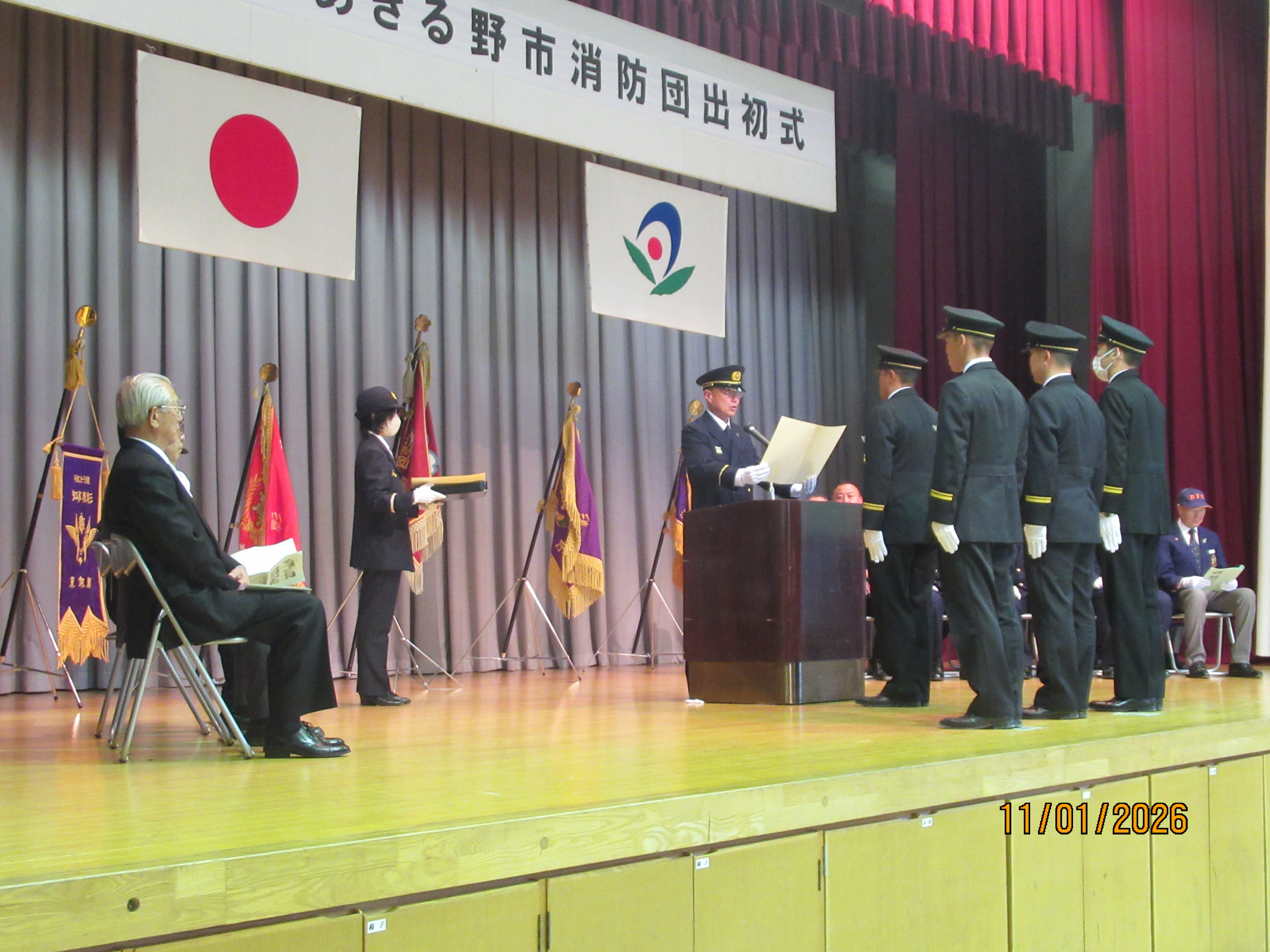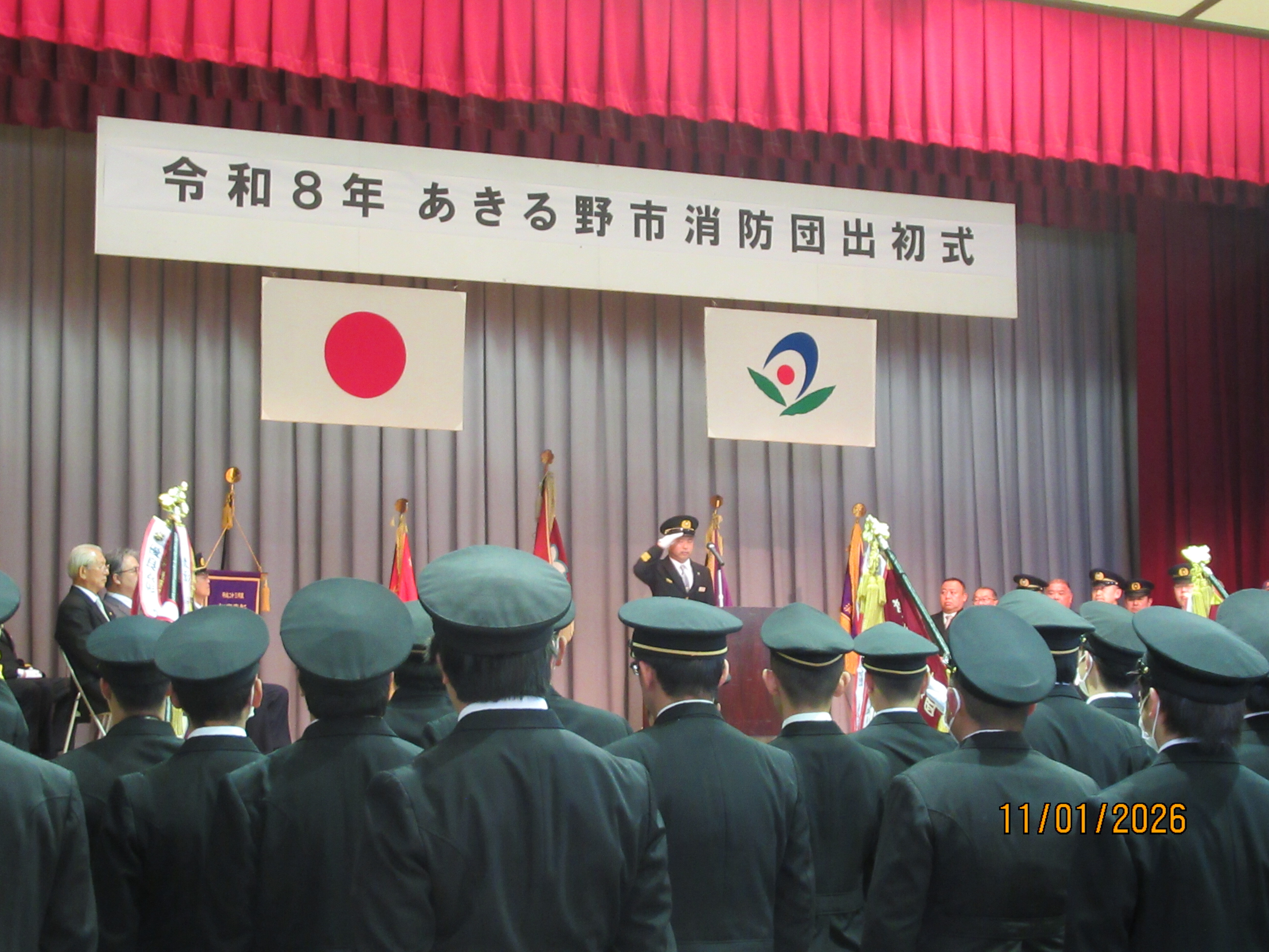 令和8年1月11日(日曜日)五日市会館において、令和8年あきる野市消防団出初式を行いました。開式後は、中嶋市長による告辞、秋山団長からの訓示、秋川消防署長の挨拶をいただきました。表彰式では、功績のあった団員や長年にわたり消防団活動に尽力した団員などに対し、表彰状が贈られました。ご来賓の皆さん、ご来場された皆さん、ありがとうございました。