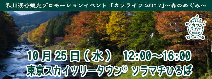 秋川渓谷の豊かな自然や都心では味わうことのできない魅力的なライフスタイルお伝えすべく、東京スカイツリータウン®「ソラマチひろば」にて、秋川渓谷観光プロモーションを実施します!