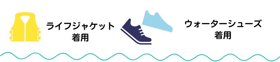 水の中や河川敷では安全のために、運動靴や脱げにくいウォーターシューズなどを履きましょう。