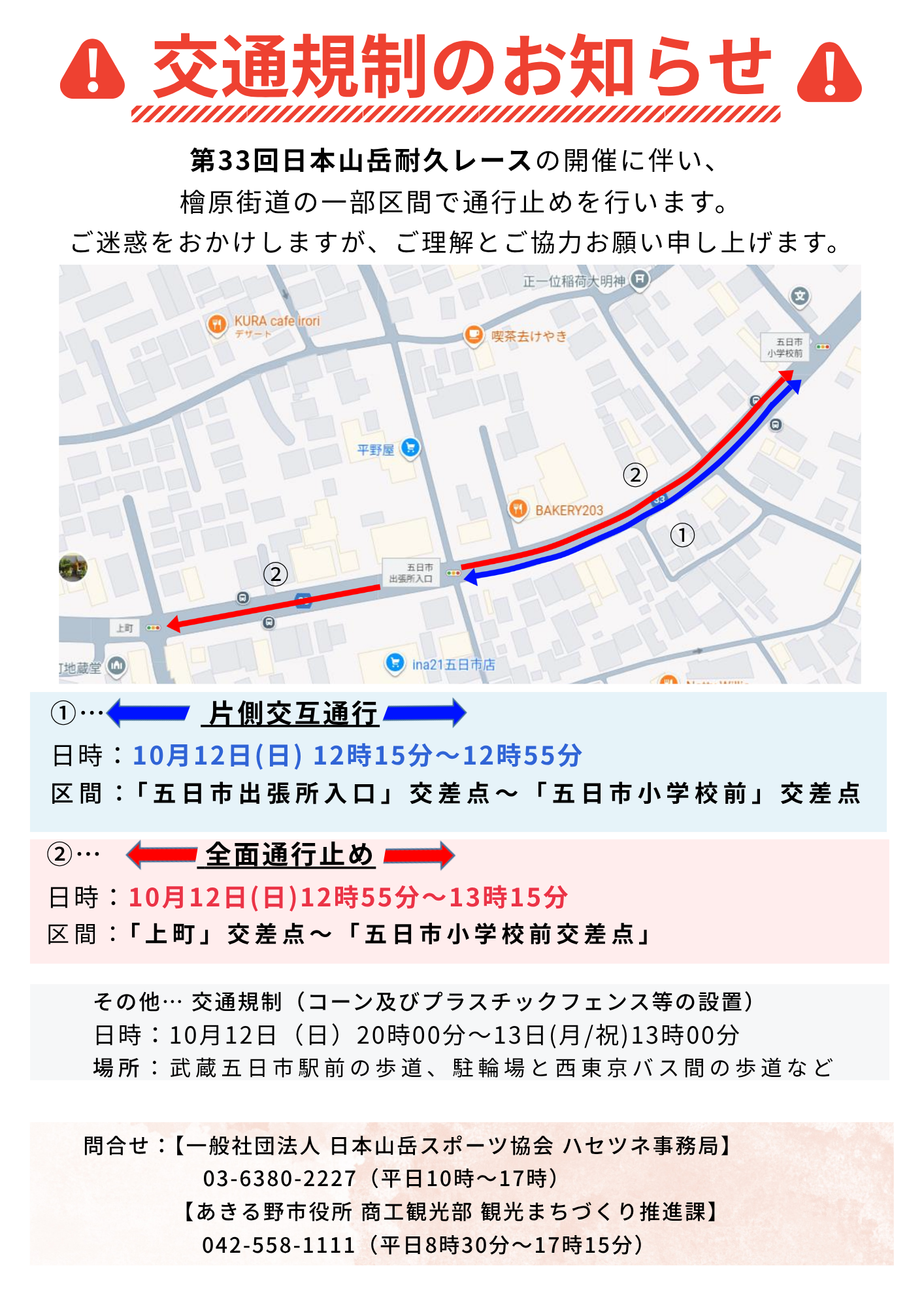 第33回日本山岳耐久レースの開催に伴い、10月12日(日曜日)に檜原街道の一部区間で通行止めを行います。ご迷惑をおかけしますが、ご理解とご協力をお願い致します。